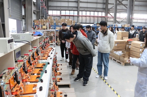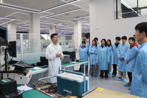 在智动绿能实验室,同学们围观着运行中的各类实验设备,在工程师的讲解下,逐步了解了基本参数测试、可靠性验证、失效分析测试等支持电力电子系统研发应用的关键的核心技术。